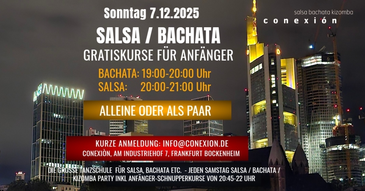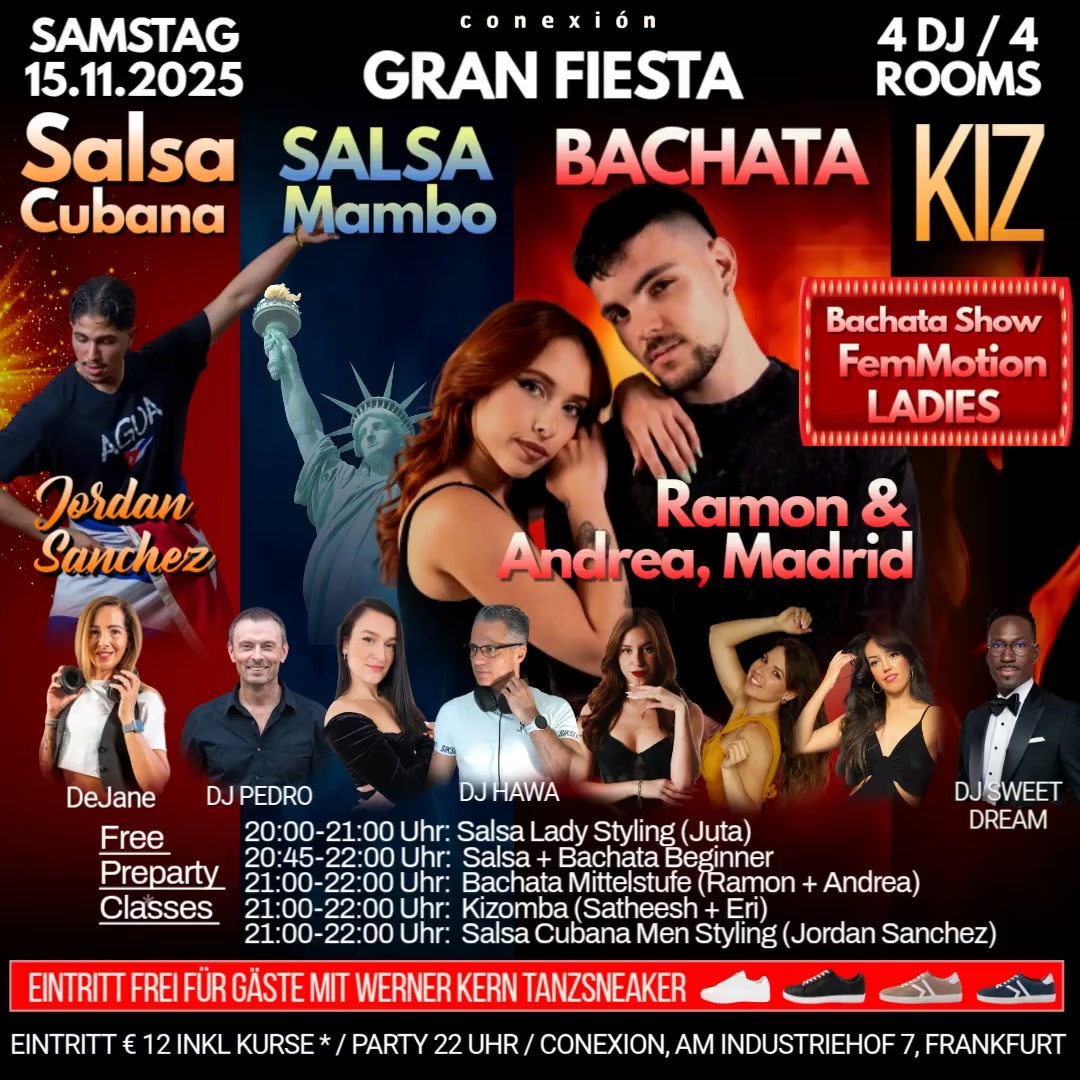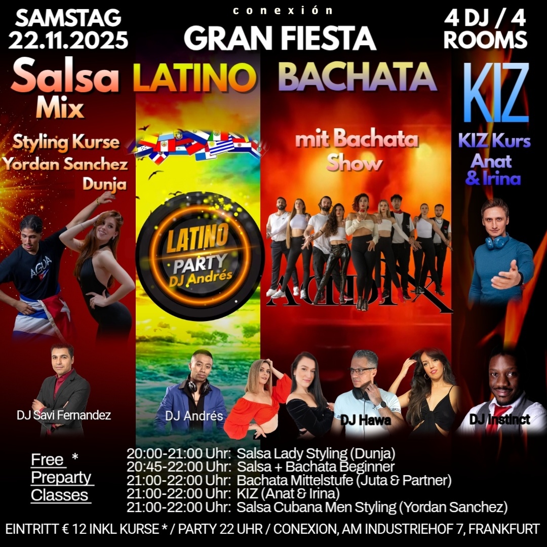 - Preparty Kurse, im Eintrittspreis inbegriffen, von 20.45 bis 22 Uhr Salsa- und Bachata Anfängerkurs, von 21 bis 22 Uhr Bachata Mittelstufe Kurs.