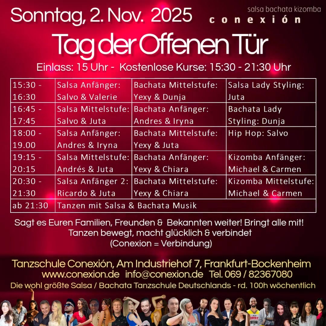 Wir bieten ab 15.30 Uhr eine Vielzahl an Gratis-Tanzkursen an. Tanzen bewegt, macht glücklich und verbindet! Lernt unsere Tanzschule und unsere Tanzlehrer kennen. Wir sehen uns am 02.11.25.